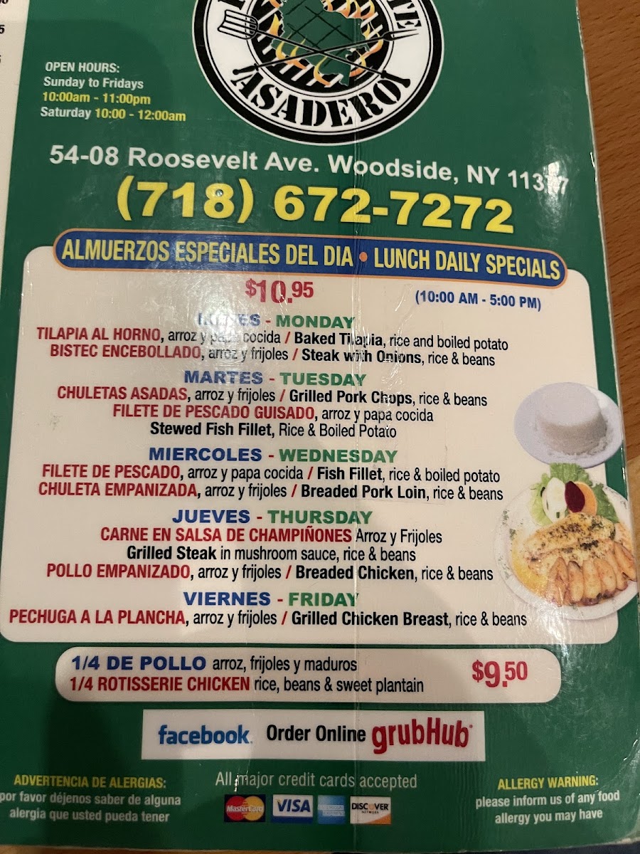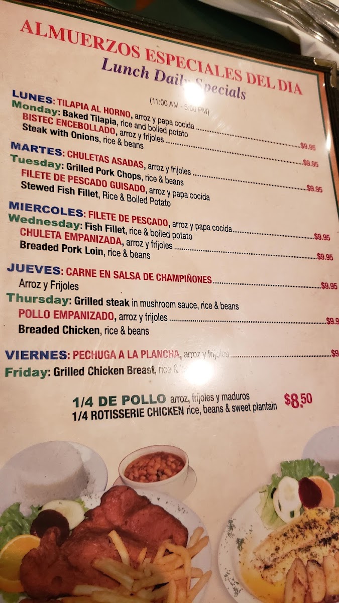 1 salad, or green plantain, 1 or rice and 1 soda 2 lt. 1 or ensalda, 1 or tostones. 1 or arroz y 1 soda 2 lt (Pepsi, Coca-Cola, naranja).